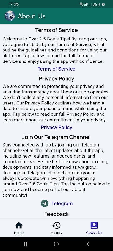 2.5 से अधिक लक्ष्य युक्तियाँ केवल सूचनात्मक और मनोरंजन उद्देश्यों के लिए बनाई गई हैं। ऐप सटीकता या जीत की गारंटी नहीं देता है और जुआ मंच प्रदान नहीं करता है। सभी भविष्यवाणियाँ राय दर्शाती हैं और इन्हें वित्तीय या सट्टेबाजी सलाह के रूप में उपयोग नहीं किया जाना चाहिए। सूचित रहें, जिम्मेदारी से आनंद लें, और 2.5 से अधिक लक्ष्य युक्तियों के साथ फुटबॉल के रोमांच का आनंद लें!