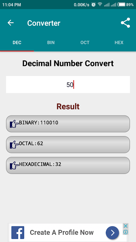 दशमलव, द्विआधारी, अष्टाधारी और हेक्साडेसिमल के संचालन के लिए एक सरल गणितीय अनुप्रयोग।
