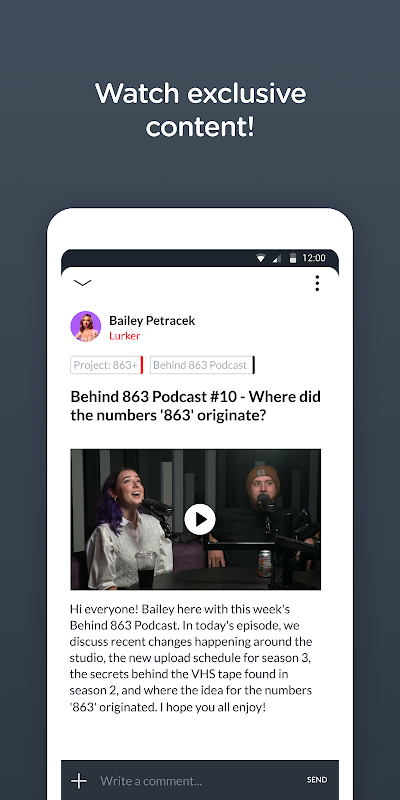 Project: 863+ is the hub to continue your journey into the 863 world with the community and creators you love. Whether you're here to support the project, to find the die-hard community like yourself, or you want to see how its all done, this app is made just for you. Project: 863+ offers 3 different tiers for you to find the fit that best suits your needs. You can join in on the conversation, watch exclusive content, and see deeper into the story. We made this for you to immerse yourself deeper into the Project: 863 world!