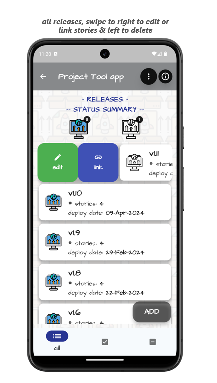 पहले दर्ज किए गए विवरणों को संपादित करने या लिंक की गई कहानियों को देखने के लिए किसी मौजूदा प्रविष्टि को दाईं ओर स्वाइप करें, रिलीज़ को हटाने के लिए उसे बाईं ओर स्वाइप करें, संबंधित बैकलॉग कहानियाँ अनलिंक हो जाएँगी।