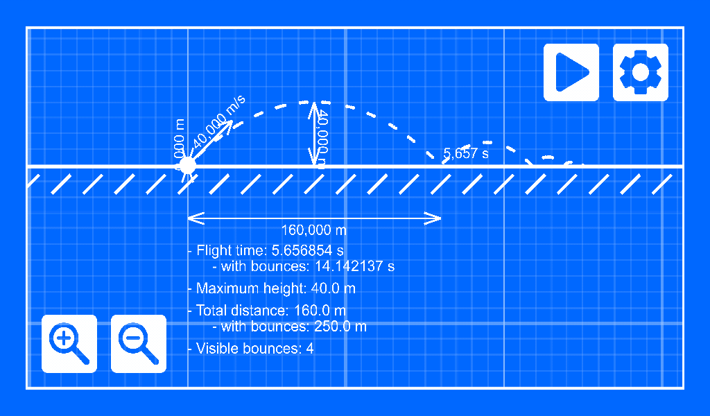 प्रारंभिक मानों (वेग, कोण, ऊंचाई, बेंसनेस) से ऐप गणना करता है: