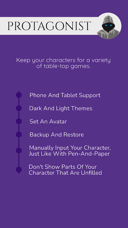 नायक आपको कई गेमिंग सिस्टम के लिए किसी भी संख्या में वर्ण पत्रक रखने देता है। आप कैरेक्टर पोर्ट्रेट असाइन कर सकते हैं, बैकअप ले सकते हैं और अपनी सेव फाइल्स को पुनर्स्थापित कर सकते हैं, और लाइट और डार्क थीम के बीच चयन कर सकते हैं।