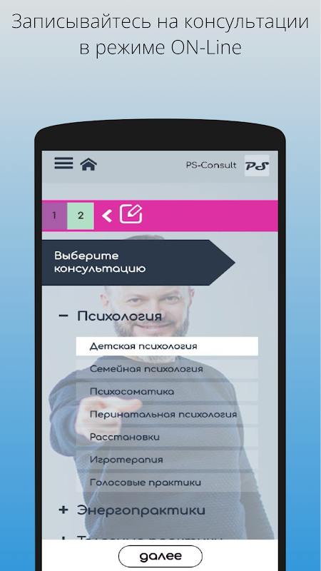 консультации - раздел в котором отображаются направления по которым участник может выбрать консультацию и записаться в удобное для него время