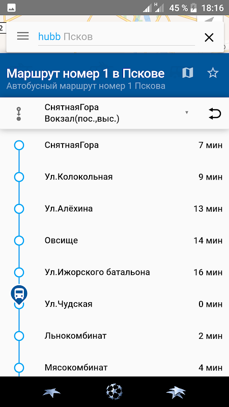 -приложение показывает в режиме реального времени транспорт оборудованный и с функционирующим GPS трекингом в городеПсков.