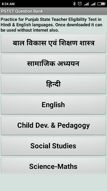 इस एप्लिकेशन का उपयोग करना, उम्मीदवारों PSTET (PTET), BTET, UPTET, Htet, RTET जैसे विभिन्न राज्य स्तर टीईटी परीक्षा की तैयारी कर सकते हैं। आवेदन निम्नलिखित विषयों में से अधिक विकल्प वाले प्रश्न (MCQ) प्रदान करता है: