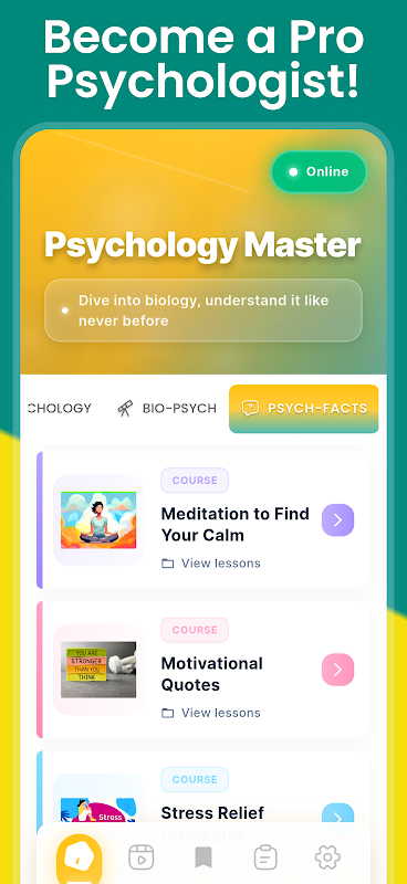 अभी डाउनलोड करें और विशेषज्ञ वीडियो पाठ्यक्रमों, इंटरैक्टिव क्विज़, व्यापक अध्ययन मार्गदर्शिकाओं, एमबीटीआई व्यक्तित्व परीक्षणों और विज्ञान-समर्थित मानसिक स्वास्थ्य उपकरणों के साथ अपनी मनोविज्ञान सीखने की यात्रा शुरू करें!