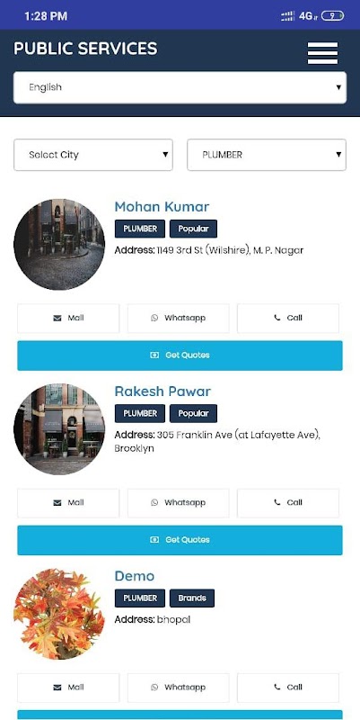 Public Services provides list of all vendors from your city who provide different services. You can now easily find the right person for your work. just select your city and select the service you require, get contact of the vendors providing those services and get your work done instantly.