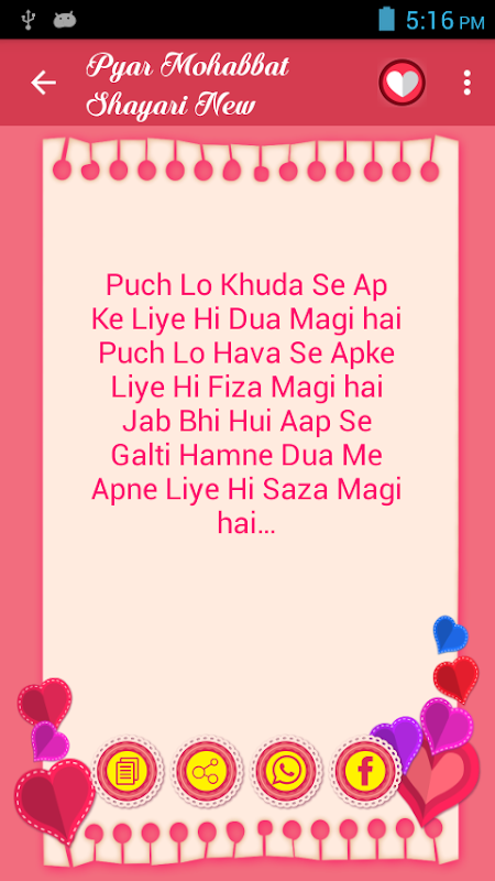 क्या आपने अपने प्रिय को व्यक्त करने के लिए सही शब्द खोजने के लिए संघर्ष किया है? अब और संघर्ष न करें क्योंकि प्यार मोहब्बत शायरी न्यू आपको अपने प्रियजन के साथ साझा करने के लिए सही शब्द, वाक्यांश खोजने में मदद करेगा।