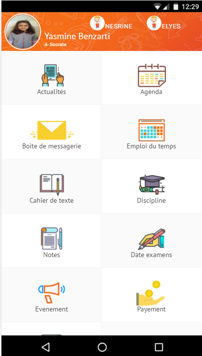 1- La session Parent/Élève : permet de gérer en même temps un ou plusieurs élèves de niveaux différents et peut contenir les menus suivants: