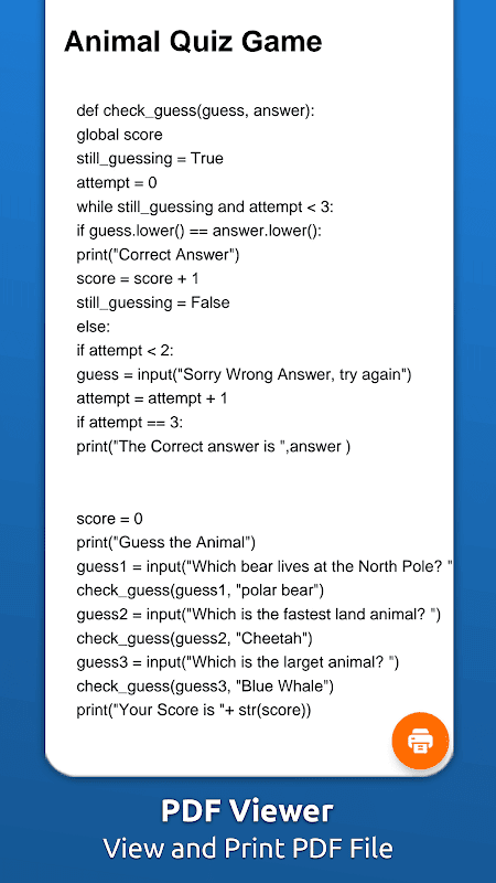 अजगर के माध्यम से पाठक आसानी से अजगर कोड सीखता है। पायथन फ़ाइल व्यूअर सभी संपादित पायथन फ़ाइल को सूचीबद्ध करेगा जिसे आप आगे उपयोग के लिए संपादक में आसानी से खोल सकते हैं। पायथन फाइल ओपनर सभी परिवर्तित अजगर को पीडीएफ फाइलों में सूचीबद्ध करता है जिसे आप पीडीएफ व्यूअर में साझा, हटा और देख सकते हैं।