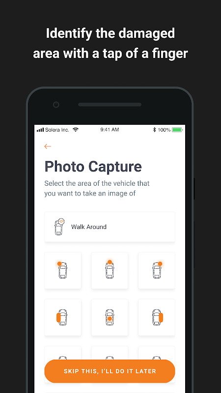 - वाहन के मास्क और वॉकअराउंड निर्देशित कदमों का उपयोग करके क्षतिग्रस्त वाहन की तस्वीरें लें।