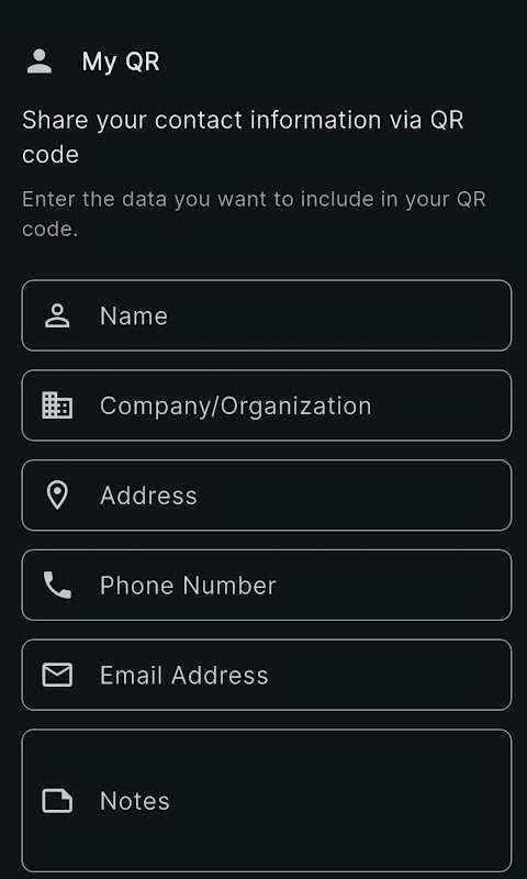 आसानी से अपने संपर्क विवरण साझा करें। अपना नाम, कंपनी, फ़ोन नंबर, ईमेल और पते के साथ एक व्यक्तिगत QR कोड बनाने के लिए "मेरा QR" सुविधा का उपयोग करें। नेटवर्किंग कभी इतनी आसान नहीं रही!