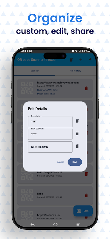 आपका डेटा, आपकी पसंद। अपनी ज़रूरत की किसी भी जानकारी—कीमत, स्थान, नोट्स, आपूर्तिकर्ता, या कुछ भी—के लिए कस्टम कॉलम जोड़कर साधारण क्यूआर कोड नंबरों से आगे बढ़ें! यह सुनिश्चित करने के लिए कि आपके रिकॉर्ड हमेशा सटीक और पूरे रहें, अपने डेटा को तुरंत संपादित करें।