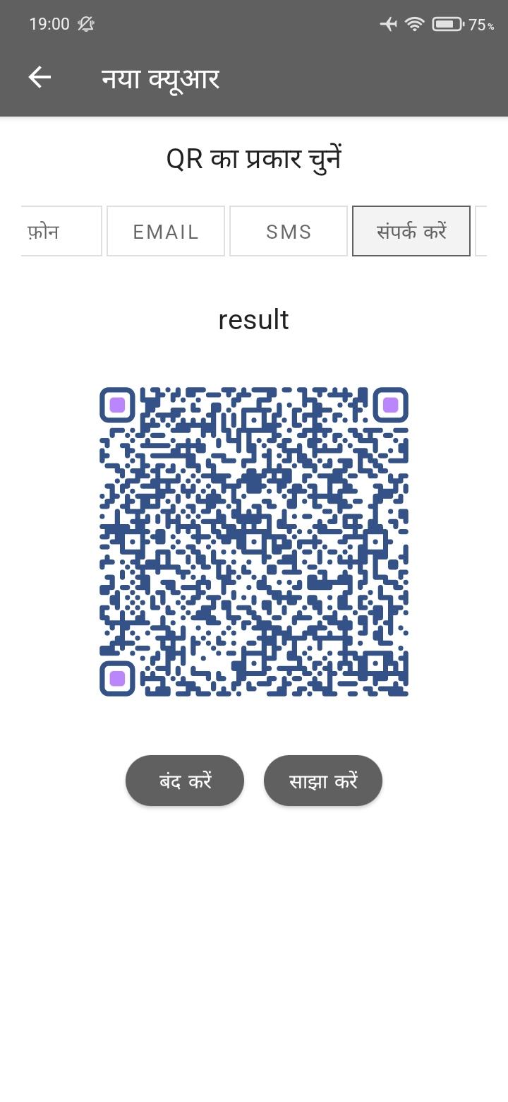 एप्लिकेशन एक क्यूआर कोड उत्पन्न कर सकता है। रेडीमेड समाधानों के साथ अपना खुद का क्यूआर बनाना आसान है: टेक्स्ट, यूआरएल, संपर्क, फोन कॉल, एसएमएस, वाईफाई, व्हाट्सएप संदेश आदि। तैयार परिणाम बिना किसी प्रतिबंध के साझा किया जा सकता है।