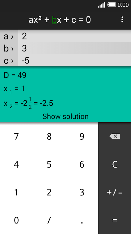 QuadCalc + द्विघात समीकरणों को हल करने और उनके हल करने की विस्तृत प्रक्रिया को देखने के लिए सक्षम बनाता है कि एक कार्यक्रम है। यह गुणांक के रूप में आम और दशमलव भिन्न के साथ दोनों काम कर सकते हैं। कार्यक्रम का उपयोग करना बहुत आसान है और एक समीकरण के जटिल जड़ों को खोजने के लिए अवसर है।