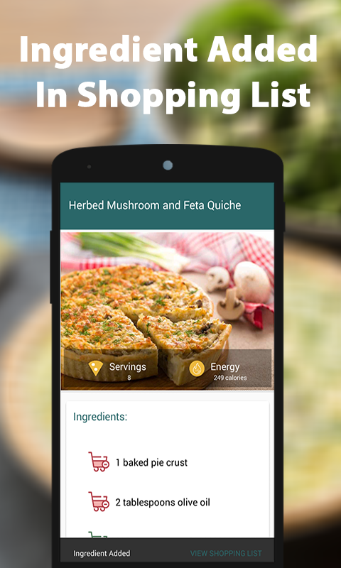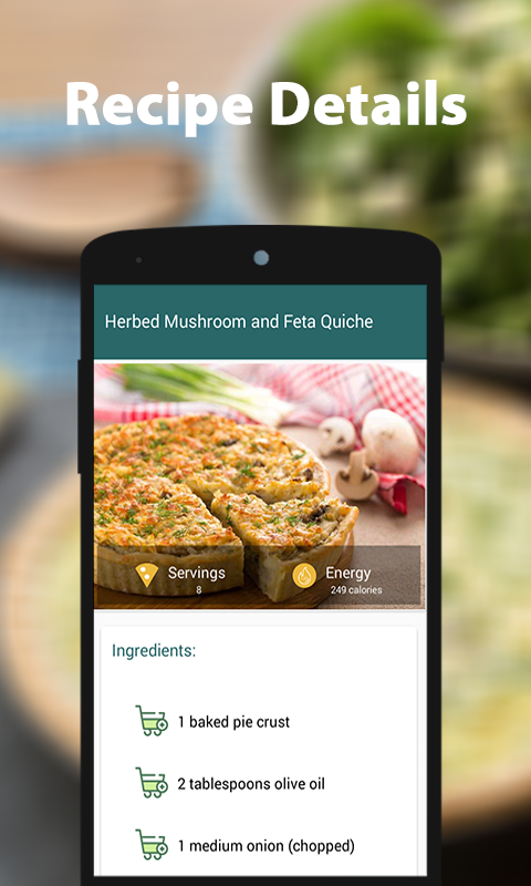 This Quiche and Savory Pie Recipes app has everything you need at your fingertips. To get started, simply download and install this app on your mobile device. Then, you can have access to all the recipes anytime because there is no more internet connection needed to run the app. Each recipe comes with a Nutritional Information and a lovely photo. This app also features a Shopping List which can greatly help you with meal planning.