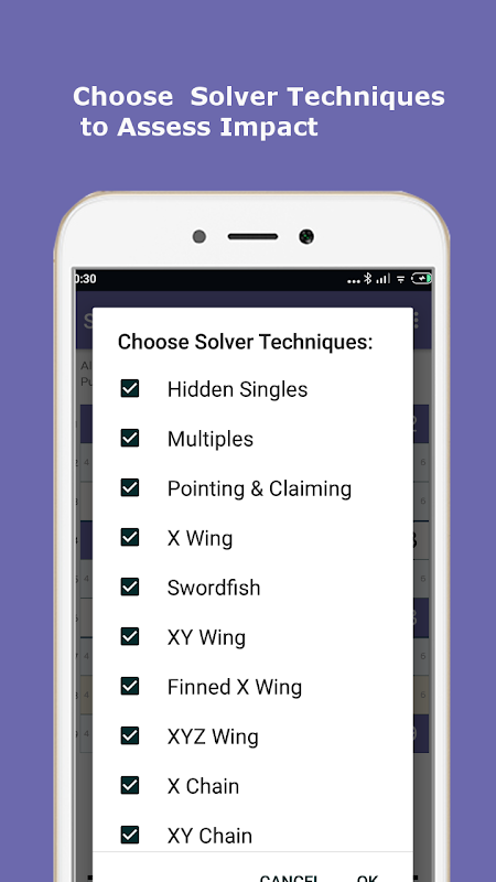 उपयोगकर्ता सुडोकू तकनीक (सुडोकू एल्गोरिदम) का चयन या चयन रद्द कर सकता है जिसका उपयोग सुडोकू सॉल्वर ऐप के मेनू का उपयोग करके सुडोकू पहेली को हल करने के लिए किया जाएगा।