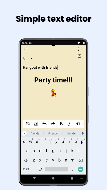 हमारा टू-डू + नोटबुक ऐप एक सहज ज्ञान युक्त इंटरफ़ेस समेटे हुए है, जिससे आप कुछ ही सेकंड में अपने नोट्स बना और एक्सेस कर सकते हैं। बस ऐप लॉन्च करें, अपने विचार टाइप करें, और उन्हें एक टैप से तेज़ी से सेव करें। इट्स दैट ईजी! चाहे आप किसी मीटिंग में हों, सड़क पर चल रहे हों, या बस चल रहे हों, हमारा नोटपैड ऐप यह सुनिश्चित करता है कि आप अपनी रचनात्मक गति को बनाए रखते हुए अपने विचारों को वास्तविक समय में कैप्चर कर सकें। फास्ट मेमो रिमाइंडर।