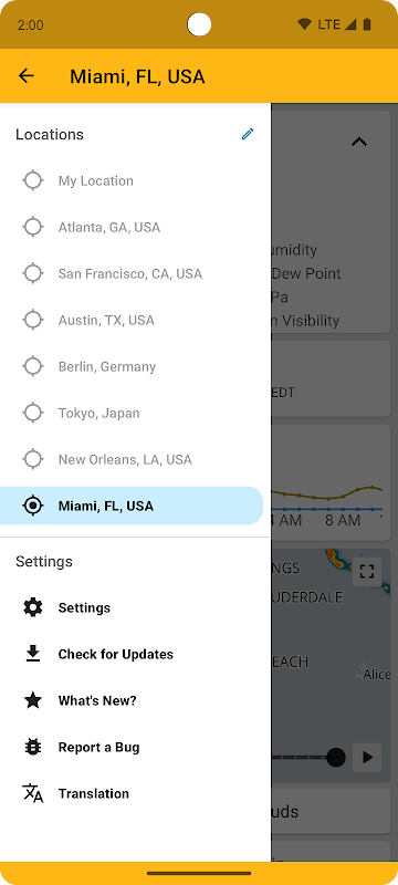 आप साइड ड्रॉअर में उतने स्थान जोड़ सकते हैं जितना आप चाहते हैं कि उनका मौसम एक टैप से दूर हो जाए। यदि आप अनुमति देते हैं तो क्विकवेदर आपका वर्तमान स्थान भी निर्धारित कर सकता है (स्थान की जानकारी एकत्र नहीं की जाती है)।