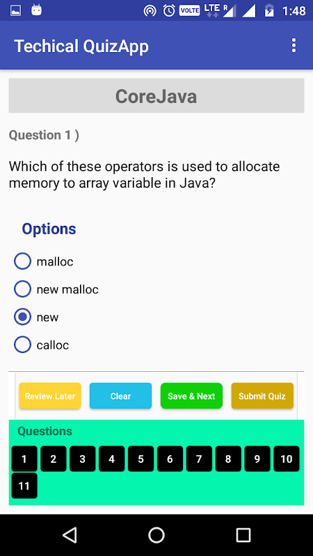 This app help you to carry Core Java, Advanced Java,ANDROID, and Data Structure programming questions in your android phone. This app has a very simple user interface and will be soon available tricky questions for all quiz.