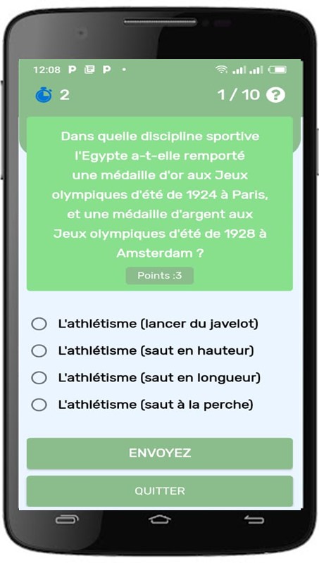 मिस्र क्विज़ "एक इंटरैक्टिव एप्लिकेशन है जिसे उपयोगकर्ताओं को मनोरंजक क्विज़ की एक श्रृंखला के माध्यम से मिस्र के बारे में अधिक जानने की अनुमति देने के लिए डिज़ाइन किया गया है। आवेदन मिस्र के विभिन्न पहलुओं से संबंधित प्रश्न प्रस्तुत करता है, जिसमें इसकी संस्कृति, राजनीति, अर्थव्यवस्था, इसका खेल, इसका इतिहास और इसका भूगोल शामिल है। .