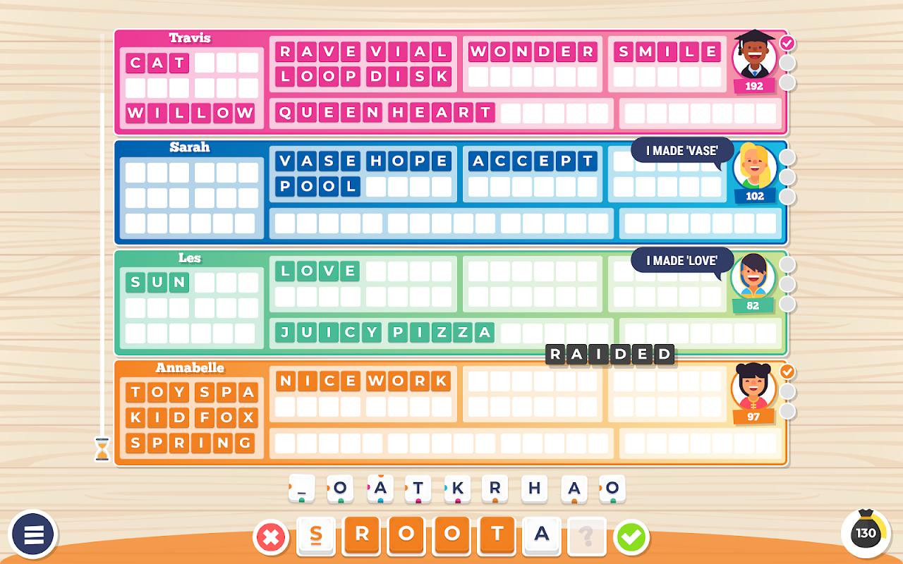 RAID ऐप में कोई "टर्न टेकिंग" नहीं है - कोई भी खिलाड़ी किसी भी समय एक शब्द या RAID एक शब्द बना सकता है। यह एक ही खिलाड़ी को दो, तीन या उससे भी अधिक शब्दों को त्वरित उत्तराधिकार में ले जा सकता है। यह अनुमेय है।