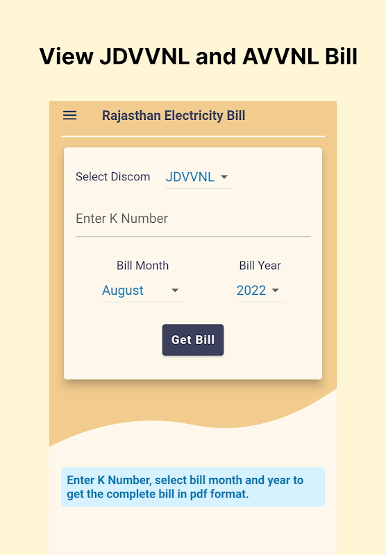 वर्तमान में, आप जोधपुर विद्युत वितरण निगम लिमिटेड (JDVVNL) और अजमेर विद्युत वितरण निगम लिमिटेड (AVVNL) के बिजली बिल देख सकते हैं। जयपुर विद्युत वितरण निगम लिमिटेड (जेवीवीएनएल) अभी तक समर्थित नहीं है।