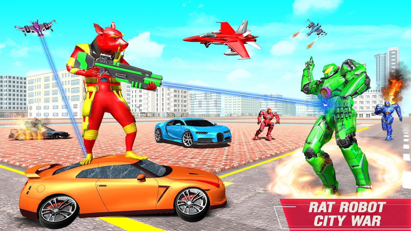 Transforming robot war started in the futuristic city after the enemy robots invasion the city this is the time when you jump into the world of car robot war games where evil robots are attacking the futuristic city and now the futuristic grand robot battle has started in Rat Robot Hero Transform Car Robot Shooting Games. Let’s start fighting the future battle of grand city robot transformation play with your rat robot to eradicate all of your robot enemies. Get ready for a mechanical city robot war to save every individual in the city with your rat robot transformation game.