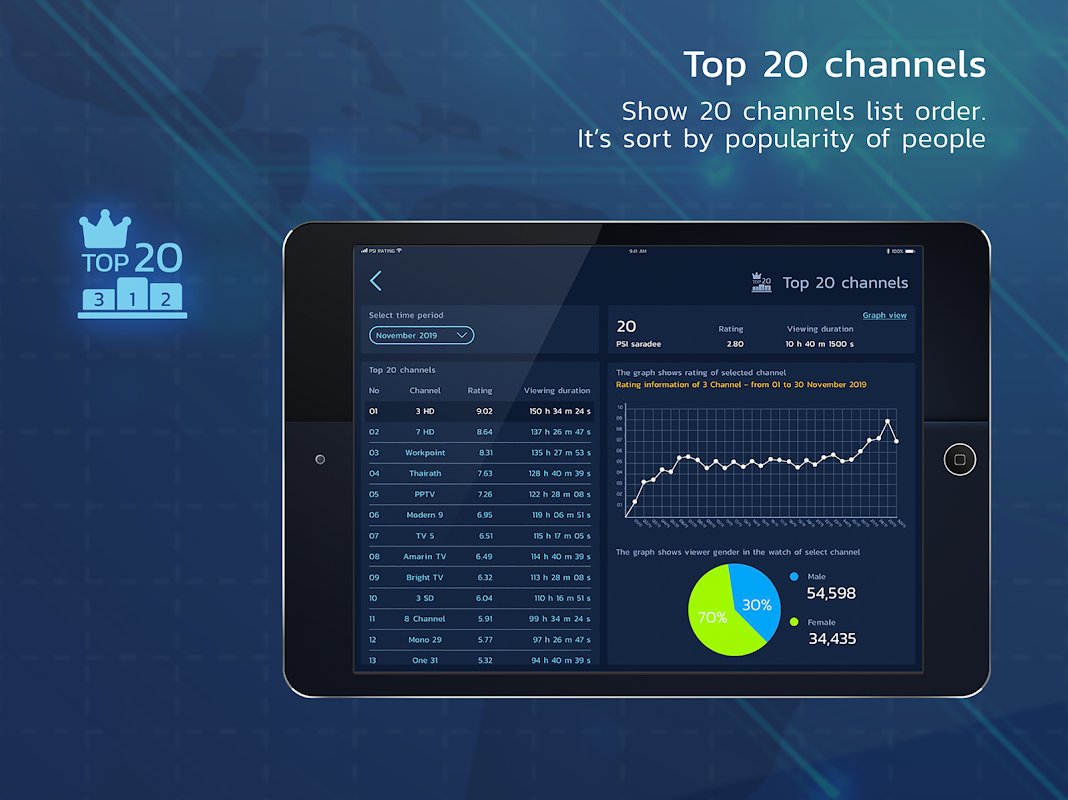 रेटिंग देखने के लिए रेटिंग ग्लोबल एप्लिकेशन। आप 20 लोकप्रिय चैनल देख सकते हैं, और वास्तविक समय में डिवाइस के सभी ऑनलाइन देख सकते हैं, और चैनलों की तुलना कर सकते हैं। एप्लिकेशन रेटिंग ग्लोबल के माध्यम से क्षेत्र द्वारा डेटा प्रदर्शन के साथ।