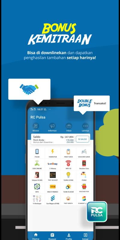 Aplikasi RC Pulsa adalah aplikasi pengisian pulsa PPOB, yang memberikan banyak keuntungan untuk dipakai sendiri ataupun untuk berjualan. RC pulsa memberikan banyak keuntungan tambahan berupa poin dan jhadiah tahunan berupa sepeda motor dan lain lain. Ayo segera bergabung dengan RC Pulsa dan dapatkan mamfaat nya