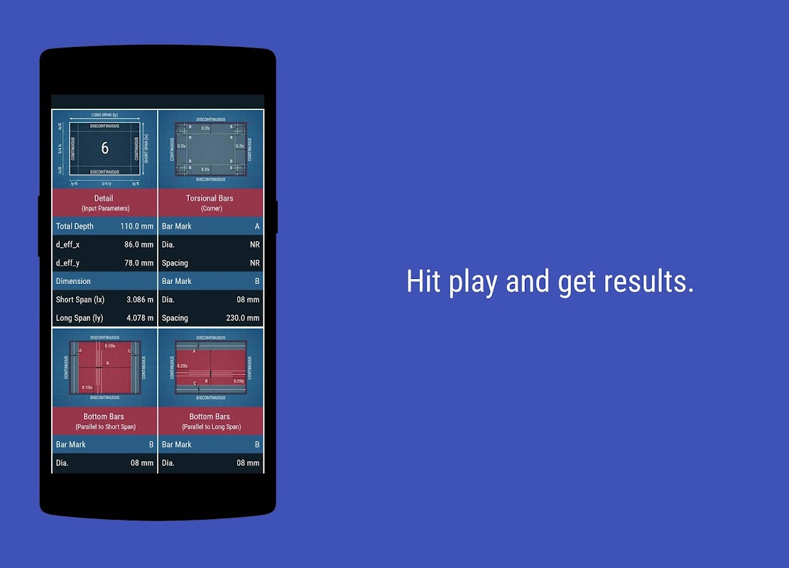 यह सिविल इंजीनियरिंग ऐप पेशेवर सिविल इंजीनियरों, स्ट्रक्चरल इंजीनियरों और सिविल इंजीनियरिंग छात्रों को भी लाभ पहुंचा सकता है। उपयोगकर्ता इंटरफ़ेस साफ़ और सहज है और डिज़ाइन आउटपुट को संक्षेप में बताते हुए परिणाम प्रस्तुत किए जाते हैं। डिज़ाइन चरण भी प्रस्तुत किए गए हैं ताकि उपयोगकर्ता गणनाओं को आसानी से जांच सके।