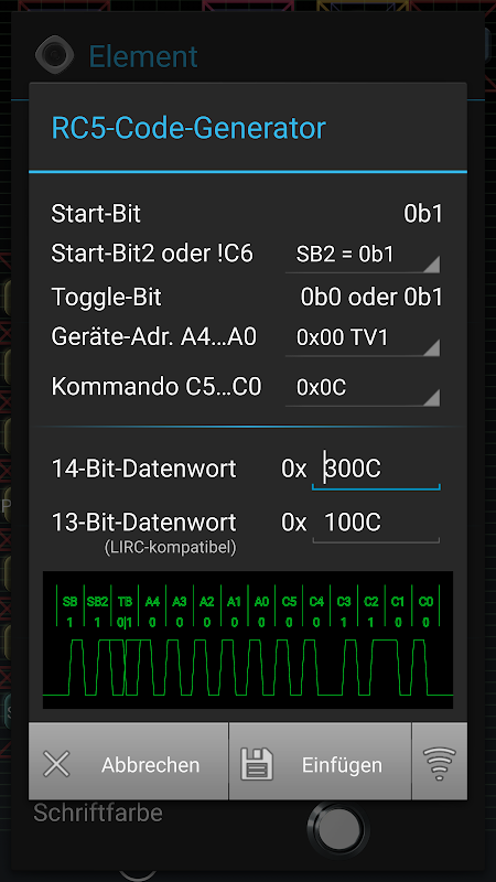 आप (एक protocoll के उल्लेख के बिना) RC5, RC6 और LIRC-फ़ाइलों के लिए आईआर कोड जनरेटर के साथ समर्थित हैं।