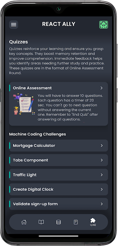 React Ally में आपका स्वागत है, React सीखने के लिए आपका पसंदीदा ऐप, जिसे शुरुआती से लेकर अनुभवी डेवलपर्स तक, अपनी विशेषज्ञता को आगे बढ़ाने के इच्छुक सभी लोगों के लिए डिज़ाइन किया गया है। व्यावहारिक उदाहरणों, इंटरैक्टिव अभ्यासों और व्यावहारिक परियोजनाओं के साथ एक व्यापक सीखने की यात्रा में गोता लगाएँ।