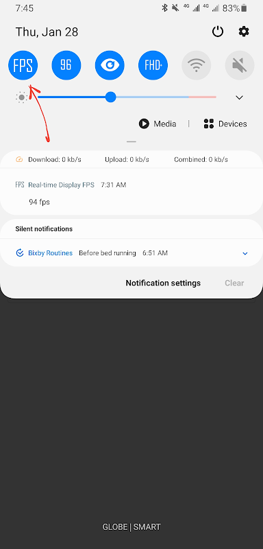 स्क्रीन पर कहीं भी अनुकूलन योग्य रीयल टाइम डिस्प्ले फ्रेम प्रति सेकेंड (एफपीएस) दिखाता है। आप इसे ओवरले या स्टेटस बार में दिखाना चुन सकते हैं।