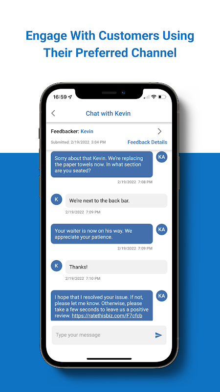 फीडबैक दें आपके ग्राहकों को उनके अनुभव के बारे में प्रत्यक्ष-वास्तविक प्रतिक्रिया देने के लिए एक शून्य-फ्रिक्शन तरीका प्रदान करता है, और आपको असंतुष्ट छोड़ने के बजाय मौके पर उनके मुद्दे को संबोधित करने का अवसर प्रदान करता है।