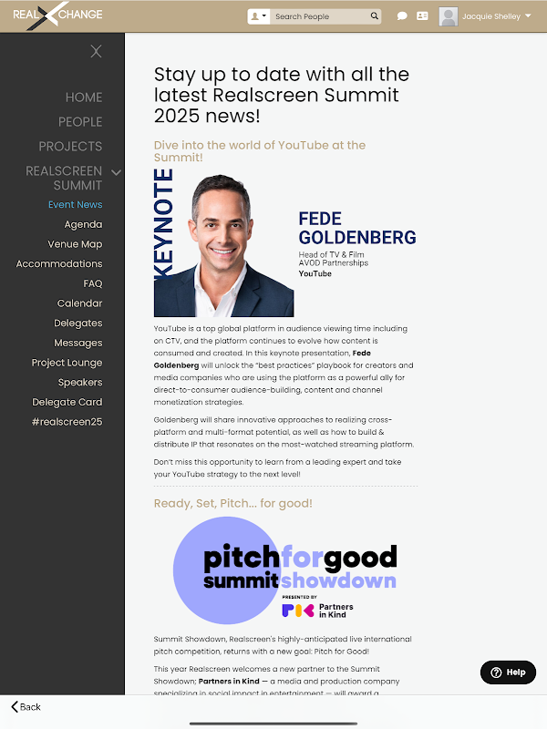 रियलस्क्रीन समिट तीन दिनों के पैनल, पिचिंग और नेटवर्किंग के लिए अनस्क्रिप्टेड और नॉन-फिक्शन प्रोग्रामिंग के निर्माताओं, खरीदारों और वितरकों को एक साथ लाता है। शिखर सम्मेलन अंतरराष्ट्रीय निर्णय निर्माताओं तक बेजोड़ पहुंच प्रदान करता है, जिससे प्रतिनिधियों को परिवर्तन लाने वाले उद्योग जगत के नेताओं से अप्रकाशित मनोरंजन के व्यवसाय में नई अंतर्दृष्टि प्राप्त करने की अनुमति मिलती है।