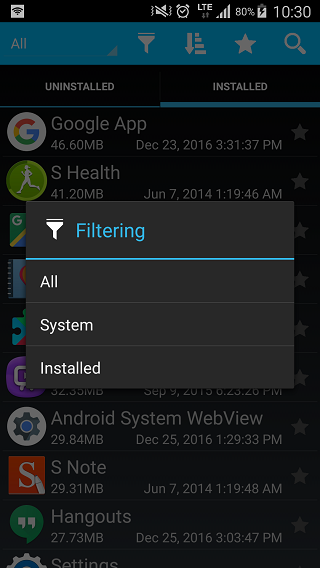 - क्रमबद्ध स्थापना हटाई और नाम, आकार द्वारा स्थापित अनुप्रयोगों, और अंतिम बार संशोधित किया।