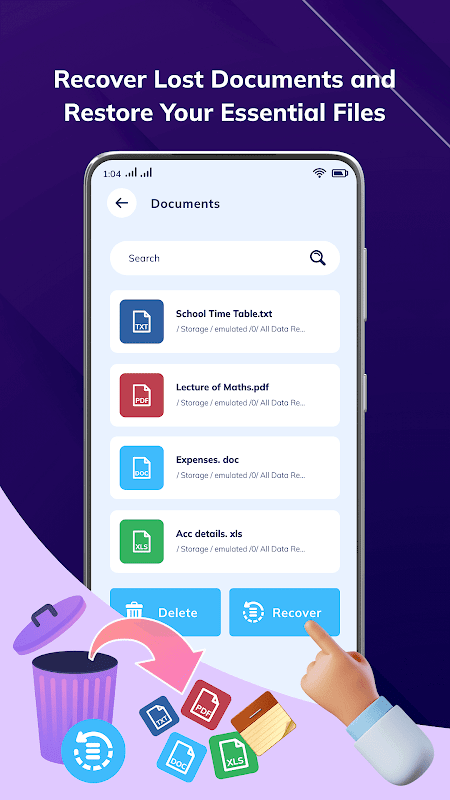 हमारे शक्तिशाली फ़ाइल पुनर्प्राप्ति ऐप के साथ अपनी छिपी हुई फ़ाइलों को आसानी से पुनर्प्राप्त और प्रबंधित करें! चाहे आप कैश, ट्रैश या अस्थायी फ़ोल्डरों में संग्रहीत फ़ाइलों को स्कैन करना, एक्सेस करना या पुनर्स्थापित करना चाह रहे हों, यह ऐप आपके लिए उपलब्ध है।