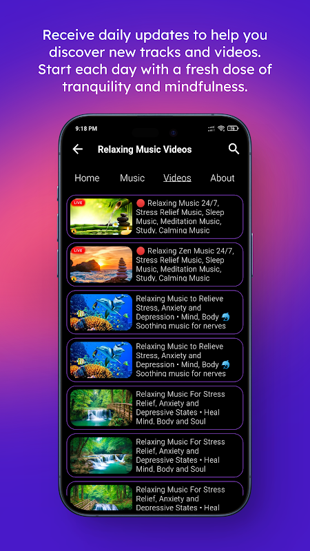 बहु-संवेदी विश्राम अनुभव के लिए मनोरम और शांत संगीत वीडियो देखें। वीडियो वास्तविक समय में लाए जाते हैं, इसलिए आपके पास आनंद लेने के लिए हमेशा ताज़ा सामग्री होती है। अनुकूलित अनुभव के लिए आसानी से ऑडियो और वीडियो मोड के बीच स्विच करें।