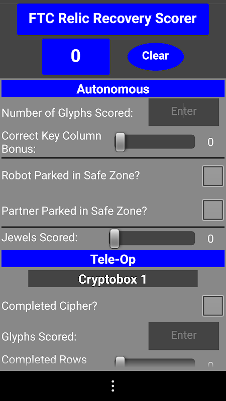 यह स्कोर करने के लिए 2017-2018 एफटीसी खेल अवशेष वसूली के लिए इस्तेमाल किया एक स्कोरिंग एप्लिकेशन है। एप्लिकेशन एक पूरे गठबंधन या सिर्फ एक रोबोट स्कोर कर सकते हैं।