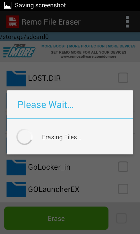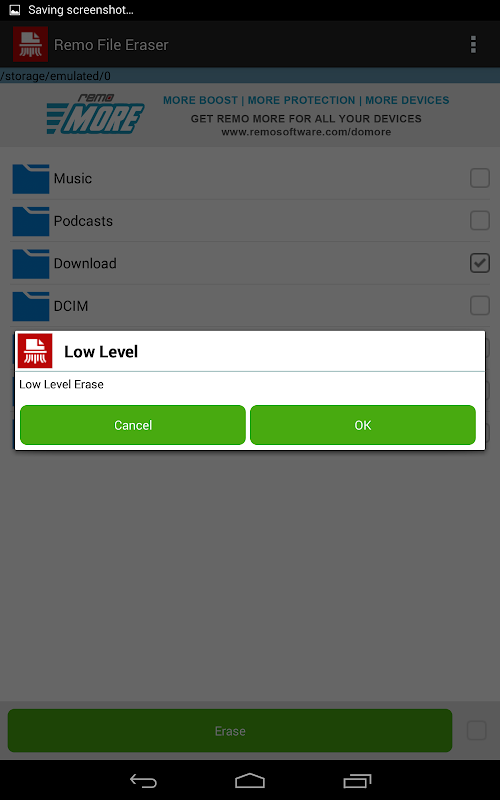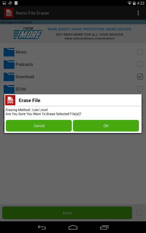 रेमो फ़ाइल इरेज़र एप्लिकेशन सुरक्षित रूप से मुक्त करने के लिए अपने Android फोन और गोलियों के दोनों आंतरिक और बाह्य स्मृति से हमेशा के लिए अपने सभी संवेदनशील फ़ाइलों और फ़ोल्डरों को मिटा देगा!