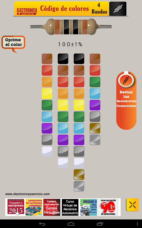 Electrónica y Servicio pone a tu disposición esta App, donde podrás conocer la codificación de colores y valores para resistencias de 4 bandas, disponible para dispositivos celulares y tabletas.
