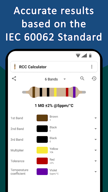 रेसिस्टर कलर कोड कैलकुलेटर (आरसीसी कैलकुलेटर) एक शक्तिशाली उपकरण है जो किसी भी प्रकार के रेसिस्टर्स की पहचान और खोज की सुविधा प्रदान करेगा, चाहे वह 3, 4, 5 या 6 बैंड हों।