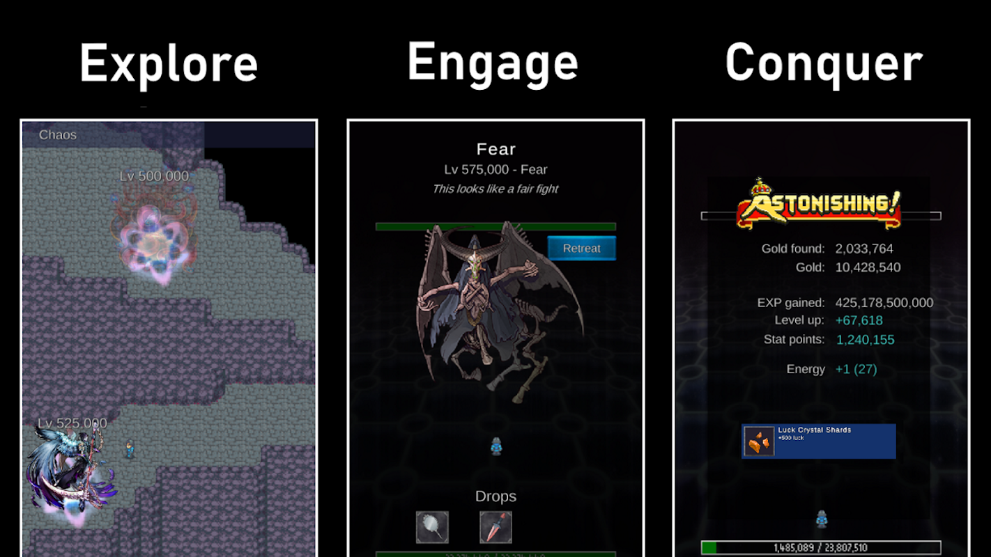मज़ेदार इंक्रीमेंटल रॉगलाइट आरपीजी. तेज़, स्वचालित लड़ाइयों में शानदार लूट पाएँ.