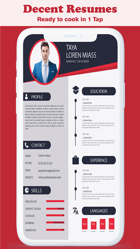 जो कोई भी एंड्रॉइड मोबाइल फोन का उपयोग करना जानता है, वह मेरा संपूर्ण बायोडाटा बनाने के लिए पीडीएफ प्रारूप में निःशुल्क सीवी बिल्डर बना सकता है। रेज्युमे मेकर बनाने के लिए बायोडाटा जानकारी, शिक्षा, अनुभव, कौशल और फोटो भरें।