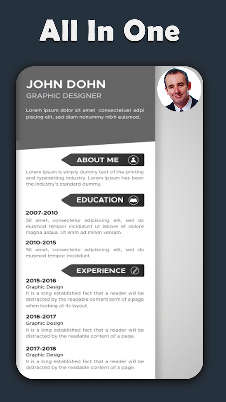 • This Resume Builder, Free Resume, Resume Builder, Resume Creator, CV, CV maker 2018 or Job Resume have the feature to generate you Resume, CV in many contain Format