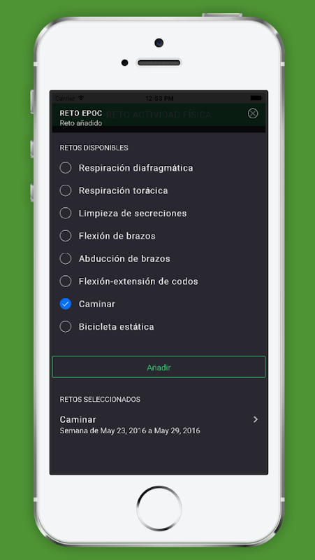 - Reto: el/la usuaria decide qué hábito/s saludable/s quiere introducir en su vida en relación a cada aspecto relacionado con la EPOC. Esta información se registra, se evalúa y se modifica o amplía en función de los resultados y deseos del/la usuario/a. Los retos y sus resultados se pueden compartir con la comunidad de usuarios/as, mediante un sistema de gammificación, estableciendo un ranking entre los/as usuarios/as.