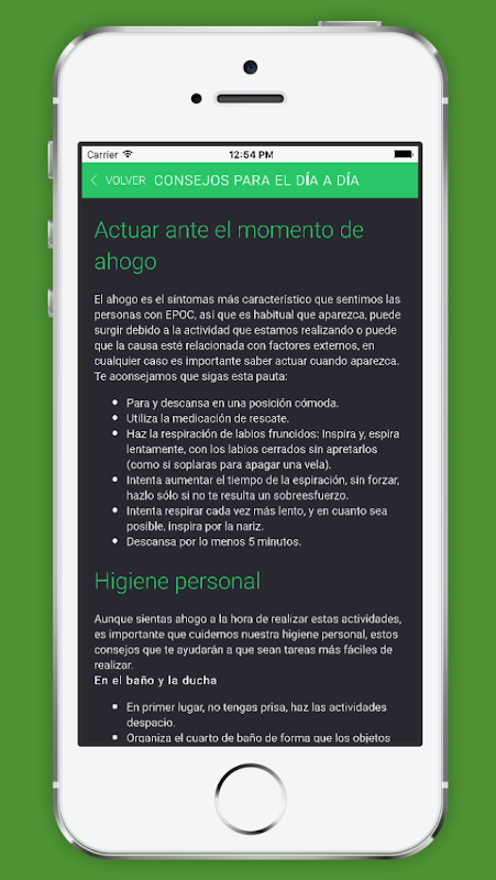 - Contenidos in-formativos, como: vídeos sobre cómo hacer ejercicios o cómo se usan correctamente los inhaladores, menús adaptados a las características del/la usuario, estrategias para abandonar el consumo de tabaco, claves para identificar las descompensaciones y sabes cómo actuar, conocer la oxigenoterapia y también consejos para el día a día (subir escaleras, hacer la compra, higiene personal, etc.)