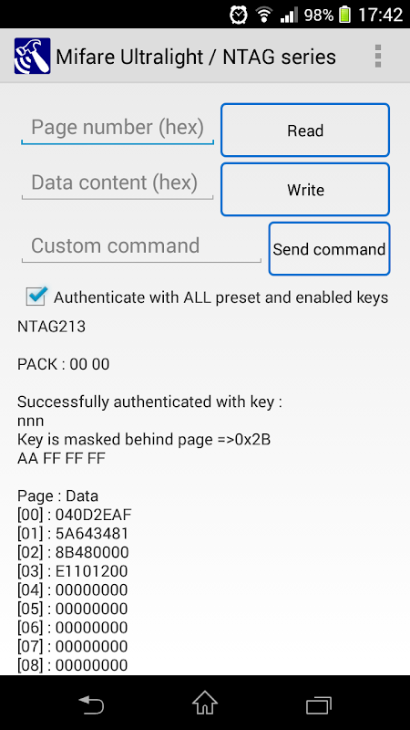 नोट: Mifare क्लासिक टैग के लिए, आप अन्यथा डिफ़ॉल्ट कुंजी ग्रहण किया जाएगा, प्रत्येक संबंधित क्षेत्र में डेटा का उपयोग करने के लिए कुंजी (ओं) जानने की जरूरत है. अधिक जानकारी के लिए इंटरनेट में एनएक्सपी के Mifare क्लासिक देखो कृपया.