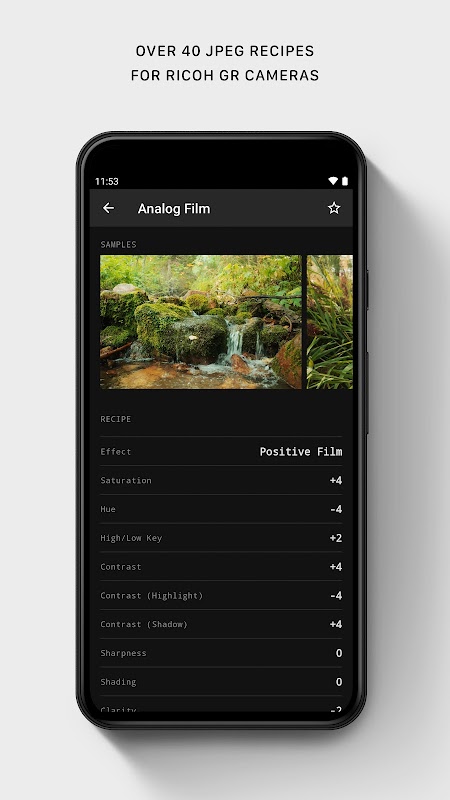 रिको रेसिपीज एक मुफ्त ऐप है जो आपको रिको जीआर कैमरों के लिए 40 से अधिक जेपीईजी व्यंजनों तक पहुंच प्रदान करता है! ये जेपीईजी सेटिंग्स आपको सीधे कैमरे से विभिन्न लुक प्राप्त करने की अनुमति देती हैं, कई फिल्म स्टॉक और एनालॉग सौंदर्यशास्त्र से प्रेरित हैं। संपादित करने की आवश्यकता नहीं है! यदि आपके पास रिको जीआर, जीआर II, जीआर III, या जीआर IIIx कैमरा है, तो इस ऐप में जेपीईजी रेसिपी हैं जो आपके गियर के अनुकूल हैं - यह रिको जीआर फोटोग्राफरों के लिए एक बेहतरीन संसाधन है! बस अपनी पसंद की रेसिपी चुनें, JPEG सेटिंग्स को आवश्यकतानुसार समायोजित करें, और शूट करें! "जीआर डिजिटल" (उर्फ "जीआरडी") कैमरों के साथ संगत नहीं है।